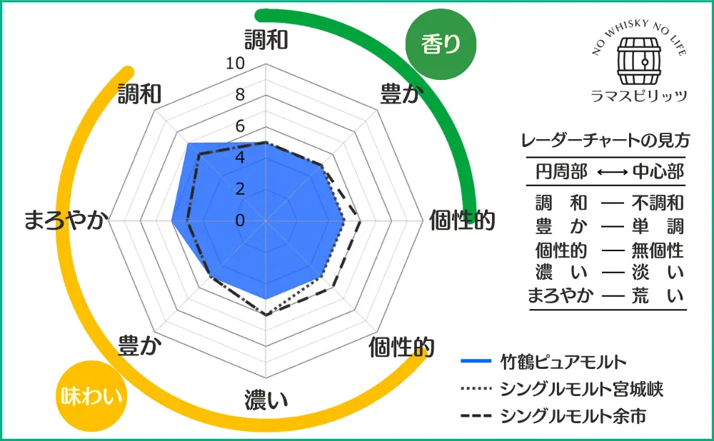 竹鶴ピュアモルトとシングルモルト余市、シングルモルト宮城峡との特性比較