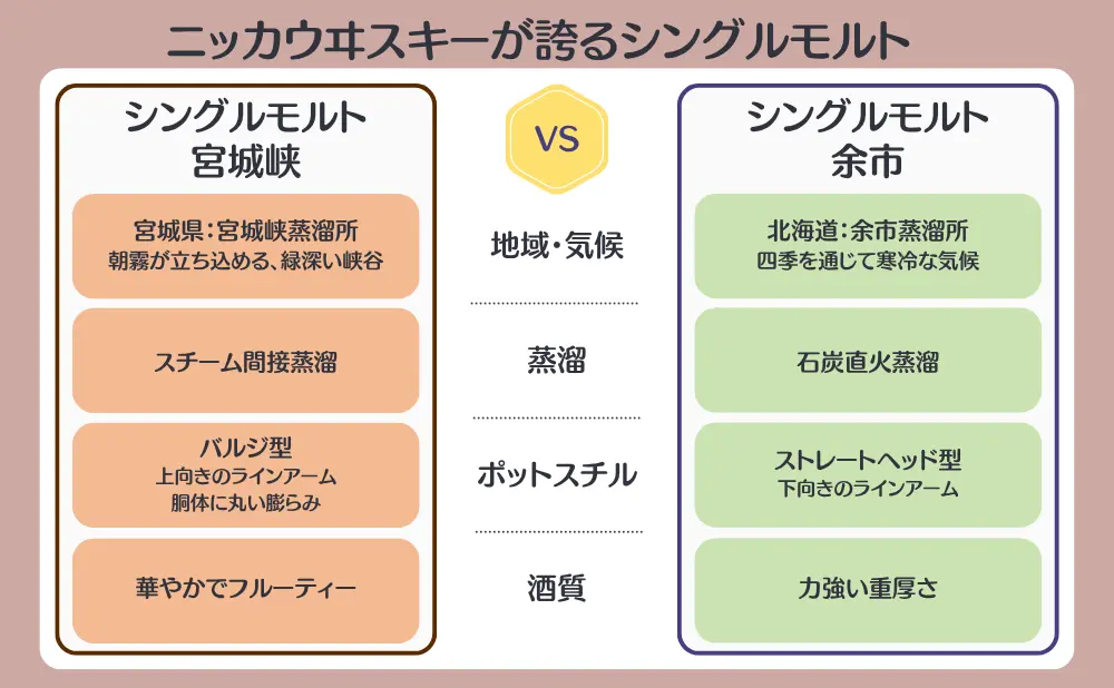 シングルモルト宮城峡とシングルモルト余市、ザ・グレンリベット12年との特徴比較